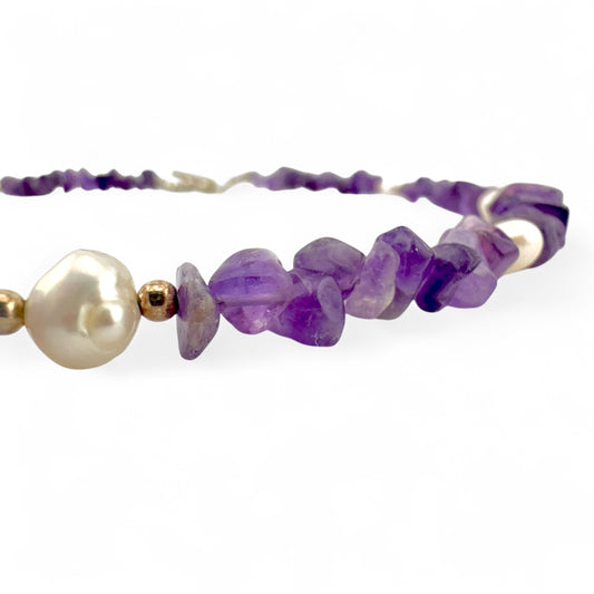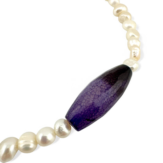 Cultured Pearl & Vintage Amethyst Art Glass Collar Length Necklace