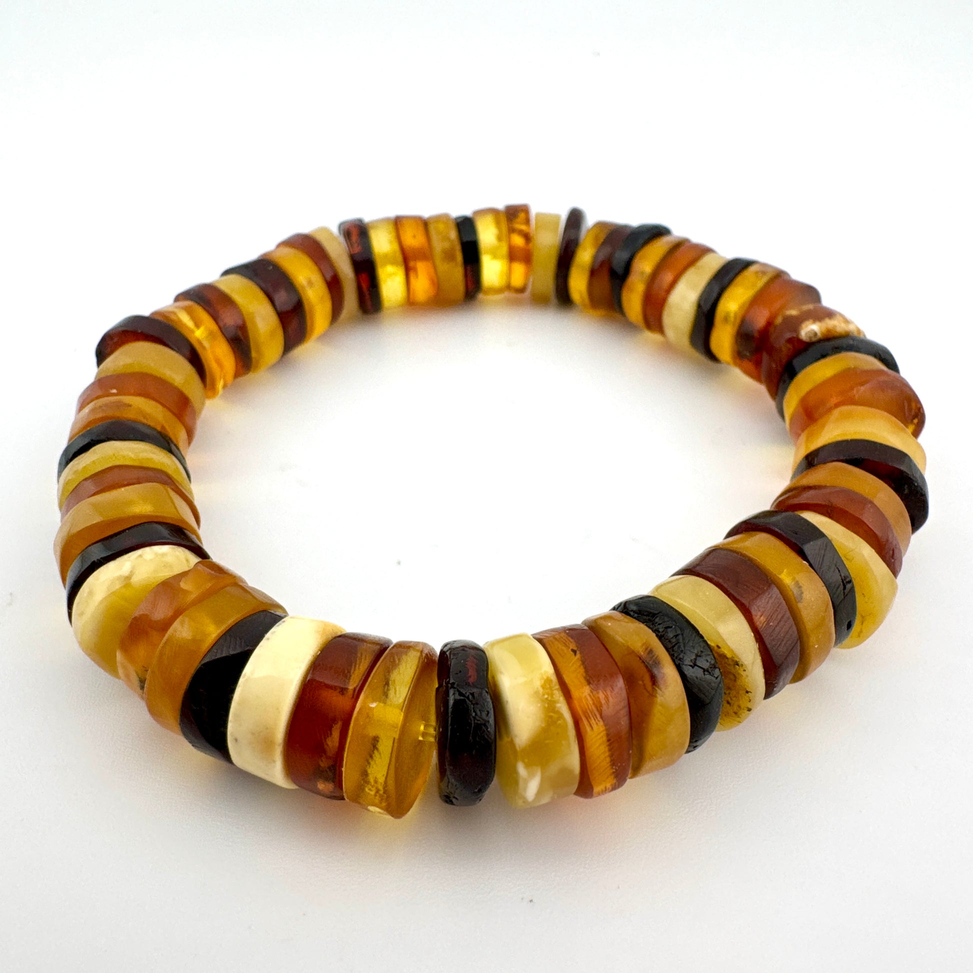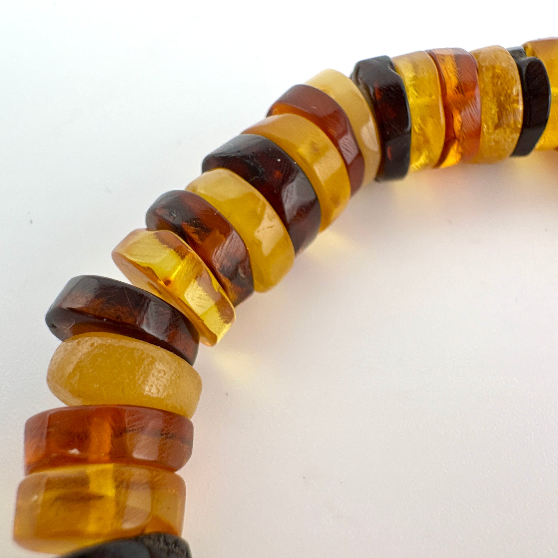 The bracelet has been carefully restrung and restored, preserving the character of the original vintage beads while ensuring it is comfortable and secure to wear. Subtle surface marks may be present, consistent with the age of the amber and part of its authentic charm.